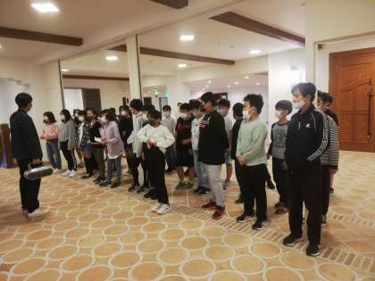おはようございます。修学旅行は2日目をむかえました。みんな発熱もなく元気に朝の集いをしました。このあと朝食です。