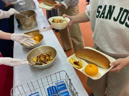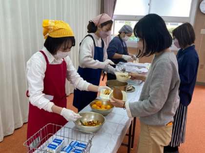 お楽しみの給食の時間、メニューは、こくとうパン、牛乳、豚肉といかの中華煮、大学いも、みかんでした。保護者の皆様で順番に並び、給食の配膳をしました。子どもの頃以来の体験の方もいて、皆懐かしい気持ちになりました。着席して、皆で「手を合わせて、いただきます。」ができたのも懐かしく良い体験でした。