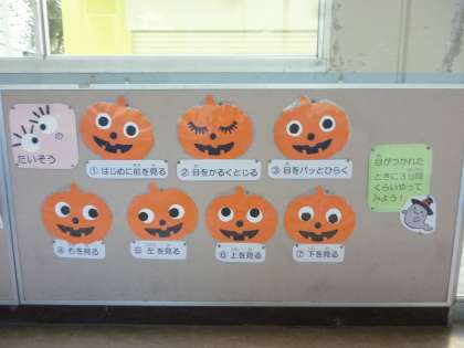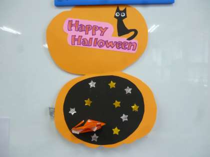 10月31日、今日はハロウィンです。校内にはその飾りつけが各所にあり、楽しい雰囲気になっています。給食調理員さんも作成に加わってもらいました。