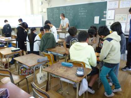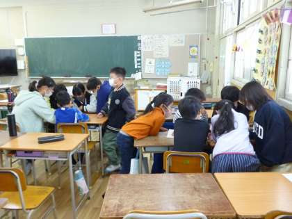 来週11月12日は土曜授業で「光ハイク」を行います。今日は朝の会の時間に、縦割りグループで当日のお店巡りの順番を相談しました。