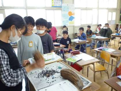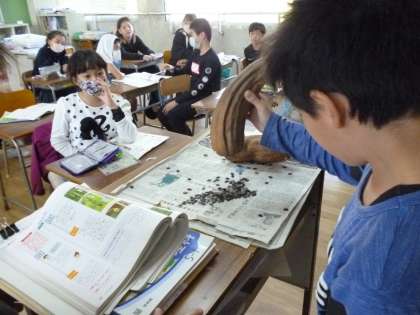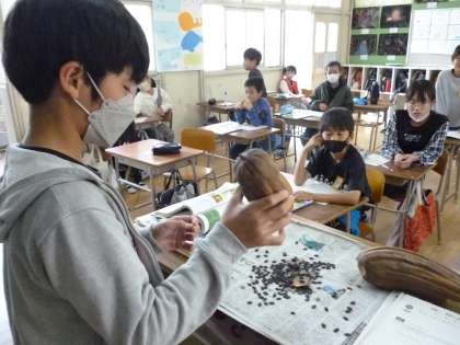 5年生はヘチマの種の観察をしました。しっかり乾燥させて切り目を付けたヘチマを振っていきました。種が下にたくさんこぼれ、内部で種ができていることがよくわかりました。