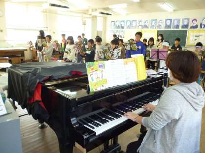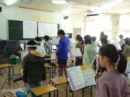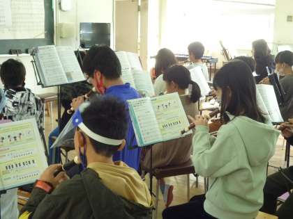 音楽室からきれいな歌声が聞こえてきました。「夢の世界を」のサビの部分は高い音ですが、みんな美しい頭声発声ができています。また、「キリマンジャロ」も、リコーダーで頑張って演奏しています。
