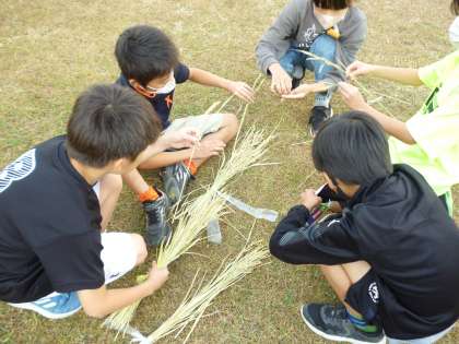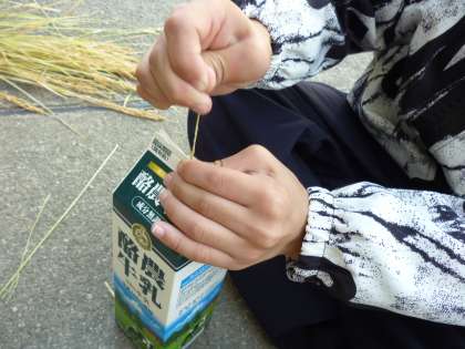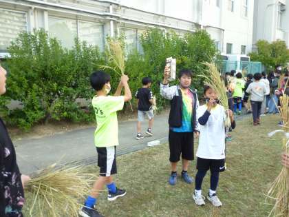 5年生は、先日稲刈りをした稲束から、もみを外す作業をみんなでしました。牛乳パックを使うと早くきれいにもみを外すことができます。時間のかかる作業ですが芝生に集合して、みんなで楽しく行いました。