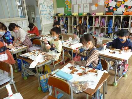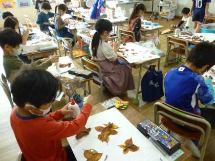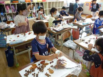 1年生は近隣で採ってきたどんぐりと落ち葉を使って花や動物などを作っていきました。画用紙に貼っていき、表現したい形に仕上げていました。
