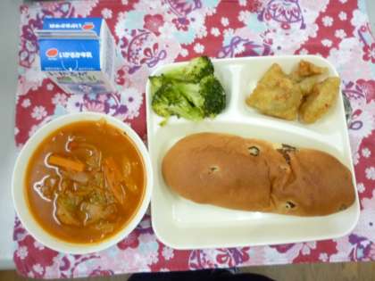 11月11日の給食は「白身魚フリッター」「ミネストローネ」「ブロッコリーのサラダ」です。白身魚はタラで、サクッとした食感でおいしくいただけました。