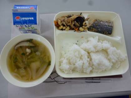 11月14日の給食は「さごしのごまじょうゆかけ」「五目汁」「大豆の煮もの」です。どの献立もご飯によく合っていました。