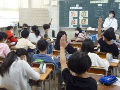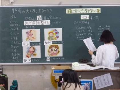 4年生は、栄養教諭から「野菜の大切さを知ろう」について教えていただきました。野菜嫌いの子どもたちが多いなか、どうやってきらいな野菜を食べているのか子どもたちに尋ねると「ちょっとだけ食べている」と答えていました。野菜は1日に300g摂取しなければいけれど、にんじん1本150gしかない、ほうれん草は加熱したら重さが減るなど、本物の野菜を見せながら説明してくださいました。どうしたら、たくさんの野菜を食べられるか、みんなで考え、「3食しっかり食事をとる」「いろんなおかずを食べる」などたくさんの意見が出てきました。