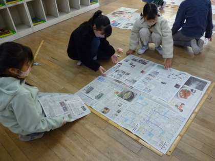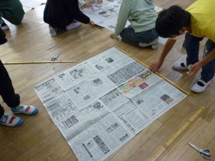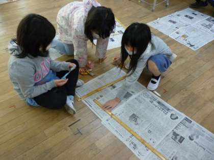 4年生は算数で広さの学習をしています。1平方メートルの広さを実感するため、新聞紙で1平方メートルを作っていきました。1メートルの物差しをうまく使って作成していきました。