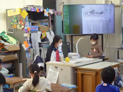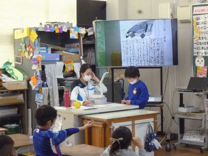 1年生は船や自動車などの乗り物について図鑑で調べました。絵と文章でまとめ、みんなの前で発表していきました。