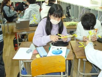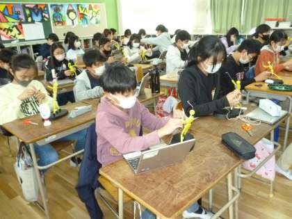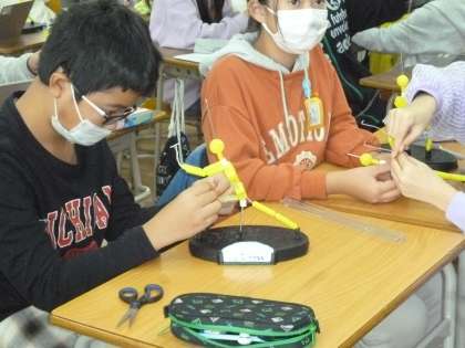 6年生は図工で「スポーツするわたし」という題材で粘土工作に取り組んでいます。木の棒で芯を作り、ひもを巻き付けて胴体を作っていました。最後は粘土で体を作っていき、スポーツをしている自身を表現していきます。