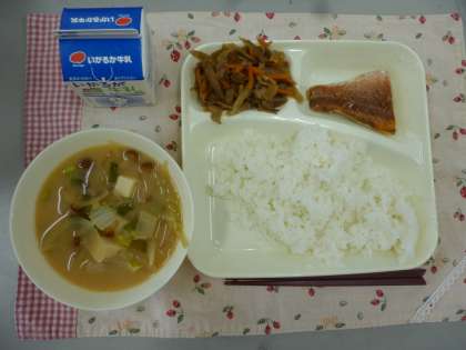 11月17日の給食は「赤魚のしょうゆだれかけ」「なめこのみそ汁」「きんぴらごぼう」です。赤魚は子どもに人気の魚です。