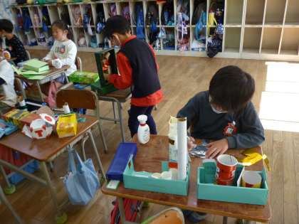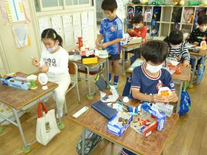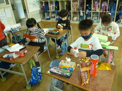 1年生はどんぐりを使って遊ぶおもちゃを作りました。どんぐりを転がして穴に入れたり、紙で作ったスロープを転がっていくようなおもちゃです。みんなそれぞれ違うアイデアで、工夫したおもちゃができました。