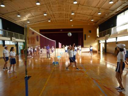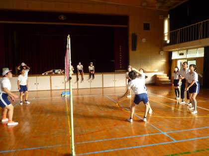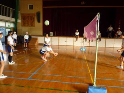 6年生は体育でバレーボールをしています。実際にネットを張って試合形式で進めていました。
