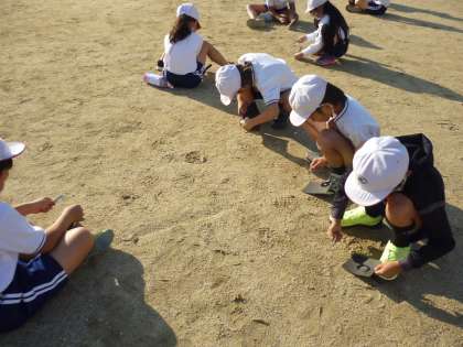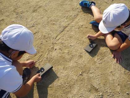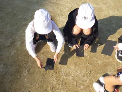 3年生は虫めがねを使って太陽光を集める実験をしました。今日は晴れなので、光を集めやすい絶好のお天気でした。光を黒の画用紙に集め、焦げる様子を観察しました。