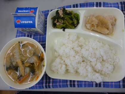 11月21日の給食は「鶏肉のおろしじょうゆかけ」「みそ汁」「小松菜のいためもの」です。おろしじょうゆは鶏肉ととても相性が合っていました。