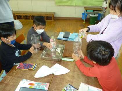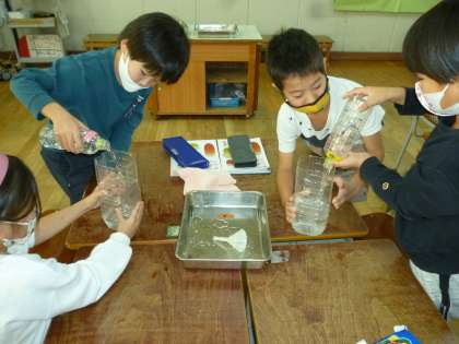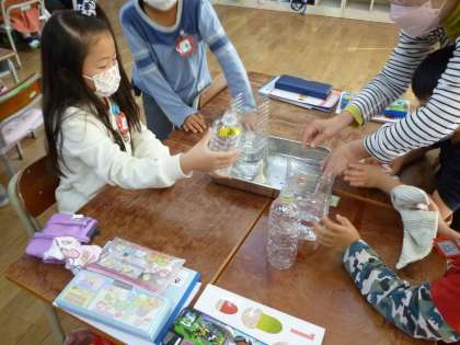 1年生は算数で水のかさを比べる学習をしました。ペットボトルを使って水を移しかえたりしながら比べていきました。