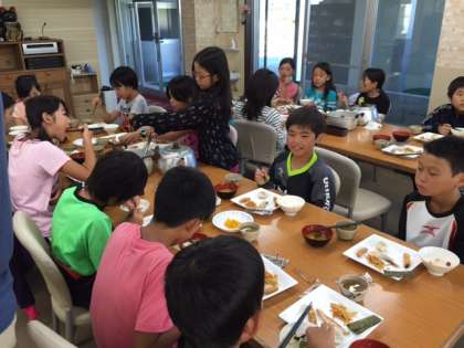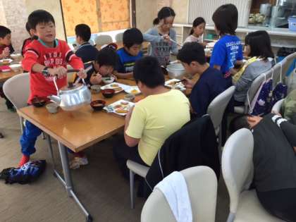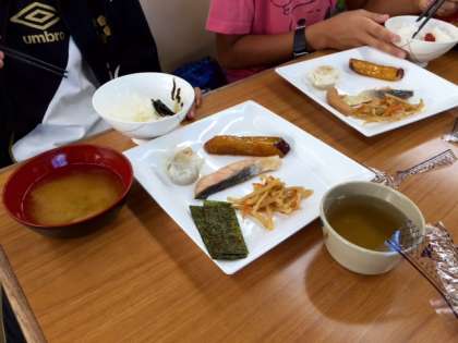 元気さのバロメーターが食欲です。朝は、軽い献立になっていますが、よく食べています。体調を崩している子どもはいません。少し休憩をとってから、高丸山から鉢伏山頂に向かって登山に出発します。
