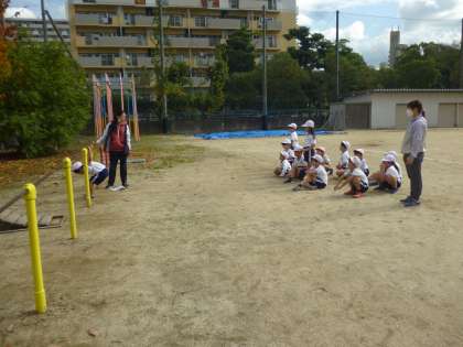 1年生は鉄棒でがんばりました。足をかけて回転する技です。怖さに負けずにやり遂げようと努力していました。