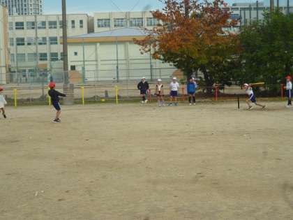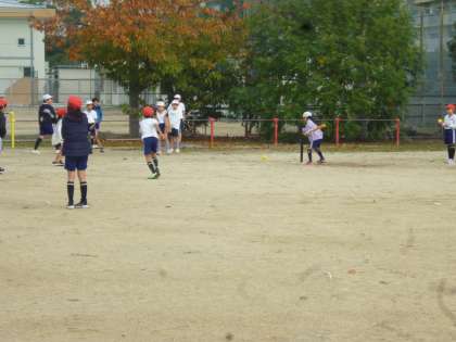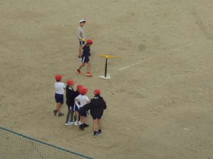 3年生は体育でTボールゲームをしています。支柱の上に置いたボールをバットで打つ野球です。簡単にボールを打つことができるので楽しいゲームです。打てば走らないといけないので、よい運動になります。