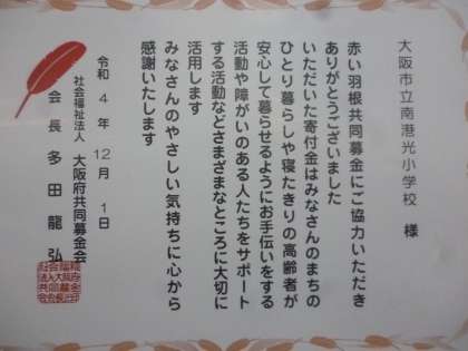 赤い羽根共同募金に取り組んだことにより「大阪府共同募金会」から感謝状が届きました。児童朝会で児童会のメンバーが代表して感謝状を受け取りました。子どもたちが募金したお金はやさしい街づくりに生かされます。
