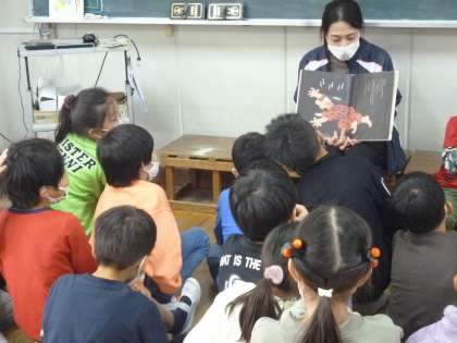 1年生は担任から「おむすびころりん」の絵本を読んでもらいました。絵を見てお話の世界に入っていきました。3学期には国語で日本の昔話を学習します。廊下には図書館補助員の先生が選んでくれた昔話の絵本がたくさん並んでいます。これからもたくさんの本に親しんでほしいと願っています。