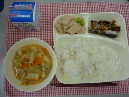 12月6日の給食は「いわしのしょうが煮」「みそ汁」「高野豆腐の煮物」です。昨日は中華料理でしたが、今日は和食で、両日ともおいしく調理されていました。