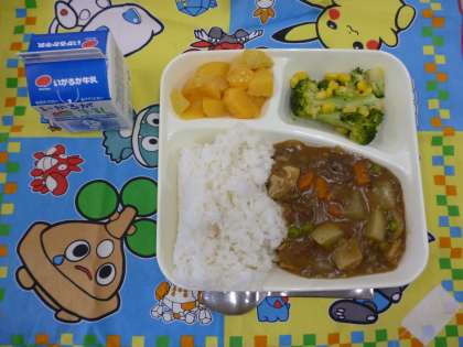 12月8日の給食は「冬野菜のカレーライス」「ブロッコリーとコーンのサラダ」でデザートに缶詰の黄桃がでました。1番人気のカレーライスは今年ラストです。