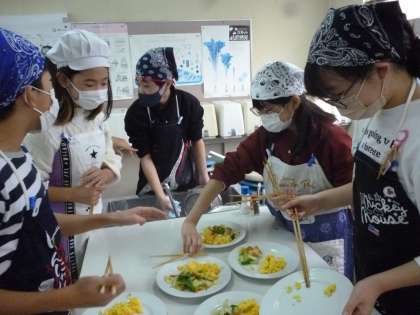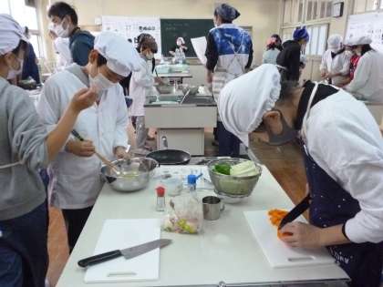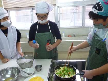 6年生は「スクランブルエッグ」と「野菜炒め」の調理実習をしました。野菜を切るのに苦労していましたが、手順を班で確認しあい、みんなよく協力し合っていました。けがややけどもなく、上手にやり遂げました。、