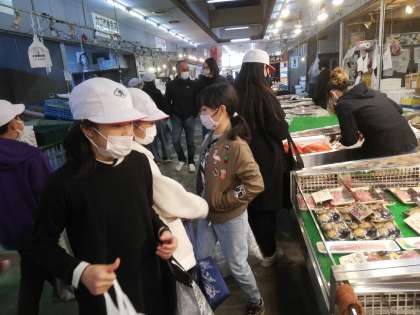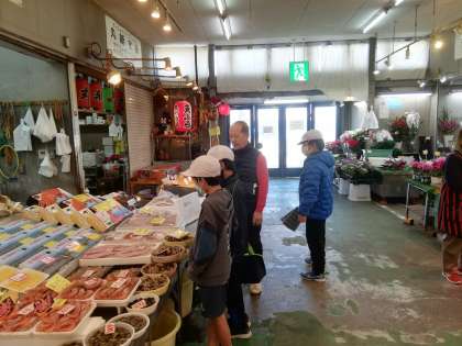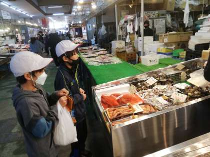 市場にはたくさんの魚類が並んでおり、何を買おうか迷っています。