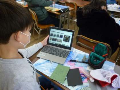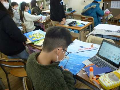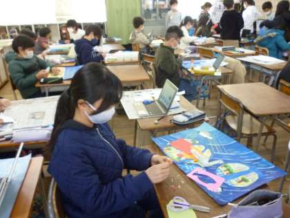 4年生は絵画「未来の海中」を描いてきて、最後の仕上げをしています。海中の生き物を調べたり、画用紙に描いて貼るなど、ていねいに進めていました。