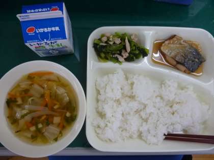 12月15日(木)の給食は、「さばのみぞれかけ」「すまし汁」「こまつなの煮びたし」でした。給食のすまし汁も、かつおぶしやこんぶでしっかりだしを取っているので、とても味わい深くておいしいです。