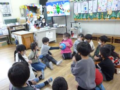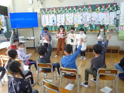 1年生はお楽しみ会をして楽しみました。グループごとにクイズなどの出し物をしたり、ボール回しなどのゲームで楽しみました。