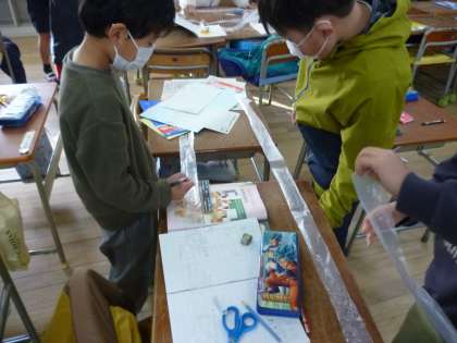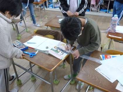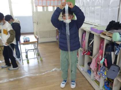 2年生は算数で自分の身長を測る学習をしました。身長と同じ長さにスズランテープを切り、ものさしで測りました。1メートルとセンチメートルで身長を記録していました。