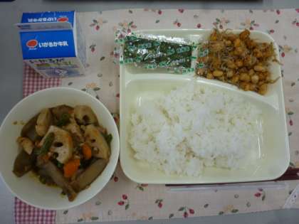 1月11日の給食は「筑前煮」「じゃこ豆」「焼きのり」です。和風味でおいしくいただけました。なお、明日はお正月献立の予定です。
