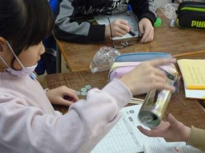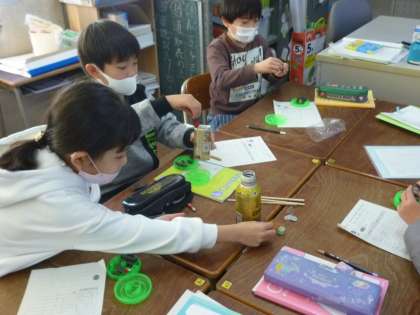 3年生は理科で磁石の実験をしました。割りばし、クリップ、スチール缶、アルミ缶、はさみなど、たくさんのものを用意して、磁石につく物とそうでない物を調べて記録していきました。