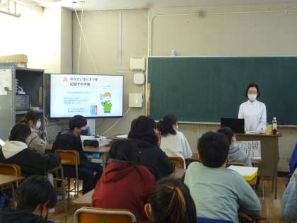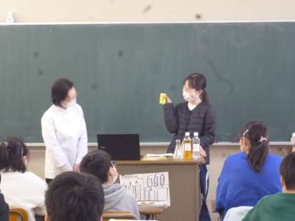 6年生は薬剤師の先生にお薬について教えていただきました。薬の正しい飲み方や薬物依存などの危険なつかい方など、実験をしながら丁寧に教えていただきました。教えていただいたことをしっかり守って、健康に過ごしていってほしいと願っています。