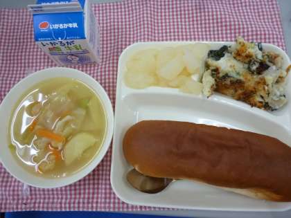 1月13日の給食は「帆立て貝のグラタン」「スープ」でデザートに缶詰の和梨がでました。グラタンは人気の献立です。