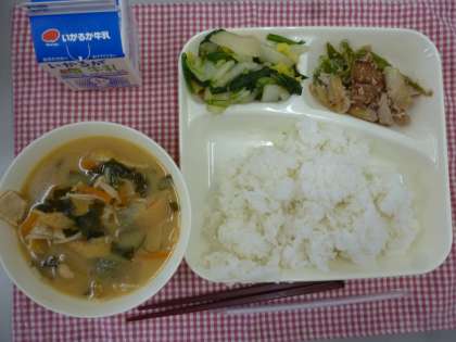1月17日の給食は「豚肉のごまだれ焼き」「みそ汁」「菊菜と白菜のおひたし」です。豚肉にごまだれがよく絡んでおいしくいただけました。