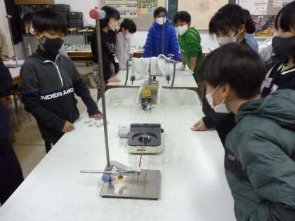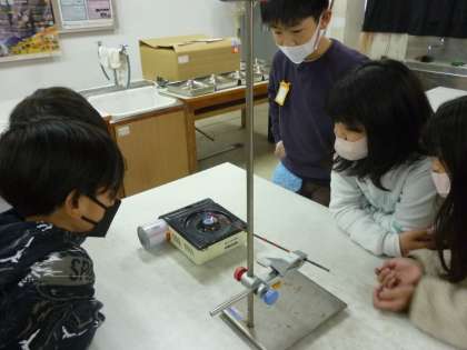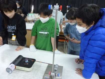 4年生はりかの実験をしました。金属の棒の端を火で熱し、尾のように熱が伝わるかの実験です。熱くなると黒く色が変わるテープが順番に端から色が変わっていくことを確認していました。