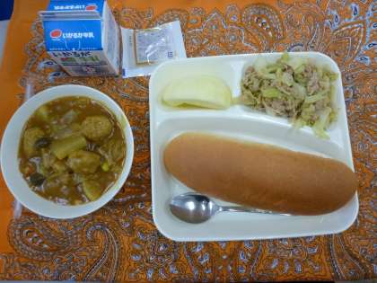 1月20日の給食は「ミートボールと野菜のカレー煮」「ツナとキャベツのソテー」でデザートにリンゴが出ました。やはりカレー味は食が進みます。