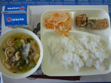 1月26日の給食は「さばのカレー竜田揚げ」「五目汁」「紅白なます」です。竜田揚げはカレー味でとてもおいしくいただけました。