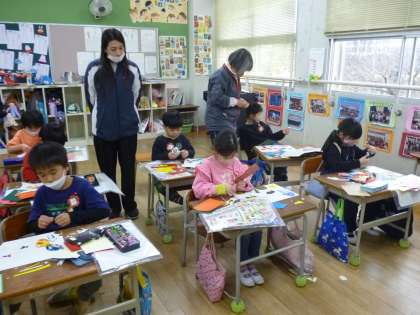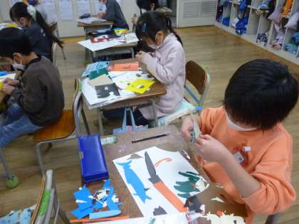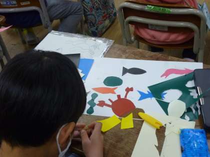 1年生は版画を作成しています。版画用の色紙を切って紙に貼っていきます。刷ると色紙の色が紙につく仕組みです。楽しい絵を色紙で作っていました。