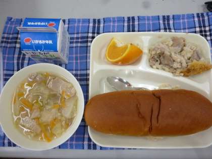 2月2日の給食は「押し麦のグラタン」「鶏肉と野菜のスープ」でデザートに伊予かんが出ました。押し麦グラタンは人気のある献立です。
