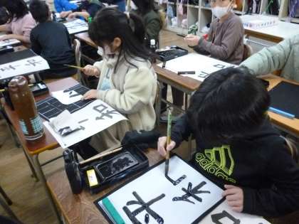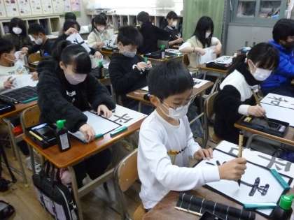 4年生は習字で「平和」の字を書きました。手本をよく見てしっかりと書いていました。