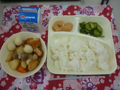 2月3日の給食は「関東煮」「きゅうりの梅風味」「白花豆の煮もの」です。白花豆はちょうどよい甘さでおいしくいただけました。