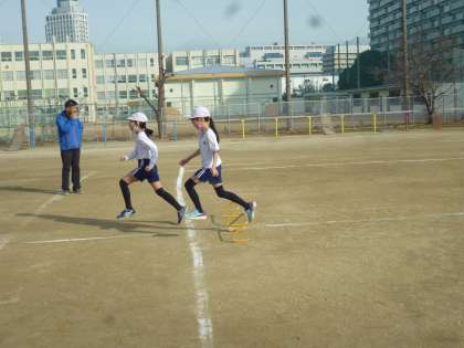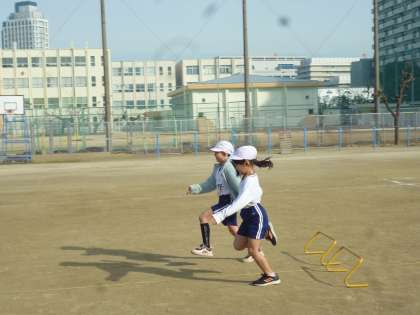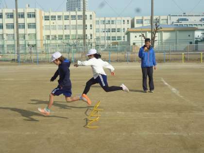 3年生はハードル走の練習をしています。まだ始めたばかりなので初期用の低いハードルを使っています。高く跳びすぎないこと、ハードル間を同じ歩数で走るなど、基本に気をつけて練習をしていました。
