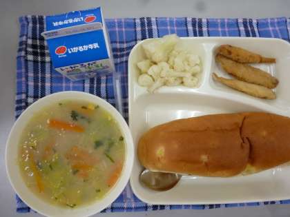 2月6日の給食は「わかさぎフライ」「コーンと白菜のスープ」「カリフラワーのサラダ」です。フライはからっと揚げており、おいしくいただけました。