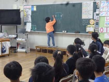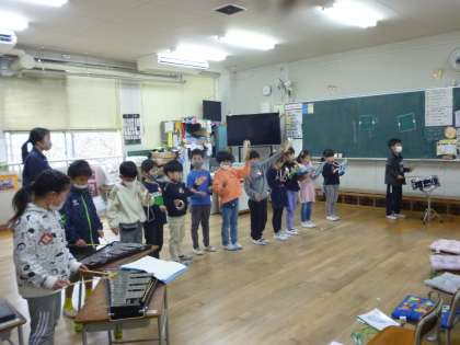 1年生は学習参観で見ていただく発表の練習をしました。各自が1年間でできたことを発表し、続いて全員の合奏、呼びかけをしました。みんなの緊張しながらも懸命な様子が素敵でした。