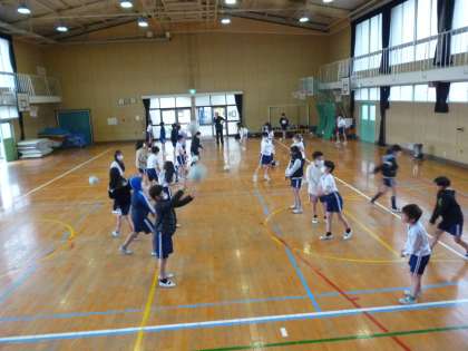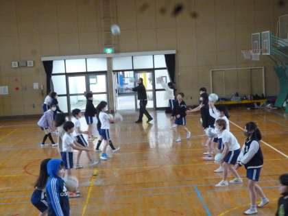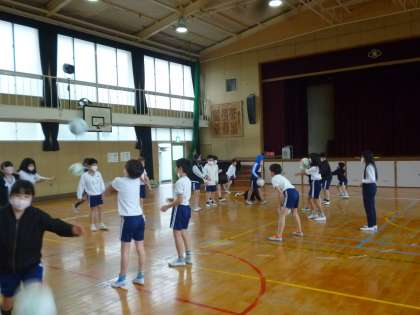 4年生は体育でバレーボールを始めました。今日は初めてなので二人で向き合ってパスの練習をしていきました。