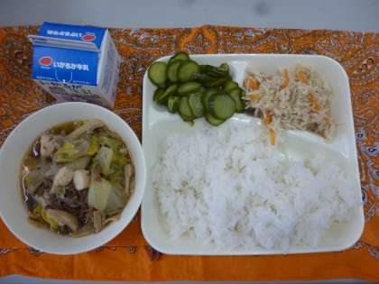 2月14日の給食は「すき焼き煮」「もやしとささみのいためもの」「きゅうりのゆず風味」です。すき焼き煮は大人気献立です。